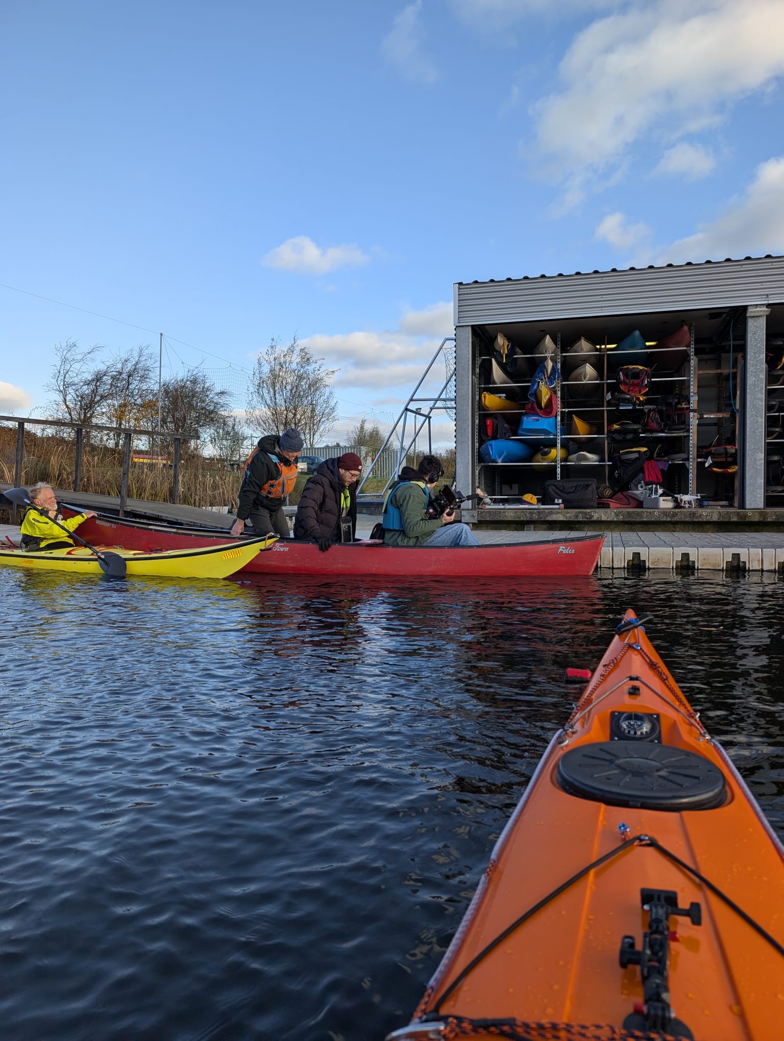 Hierna volgde de opnames van het ‘tochtje’ dat gevaren werd door vlak- en grootwatervaarders. Doordat er in november geen echte clubtochten worden georganiseerd was afgesproken dat er een rondje op de plas zou worden gevaren. De verslaggever zat hierbij in een eigen kajak en kreeg af en toe wat instructie. De cameraman en de regisseur kregen de Canadees ter beschikking. Aan Dirk de uitdagende taak om ervoor te zorgen dat de Canadees steeds in de juiste positie lag met goed zicht op de groep kajakkers en met de juiste stand van de zon, liefst met zo min mogelijk golfslag. Mathijs als tochtleider voorop maakte een rondje om het eiland bij de scouting en daarna weer terug.