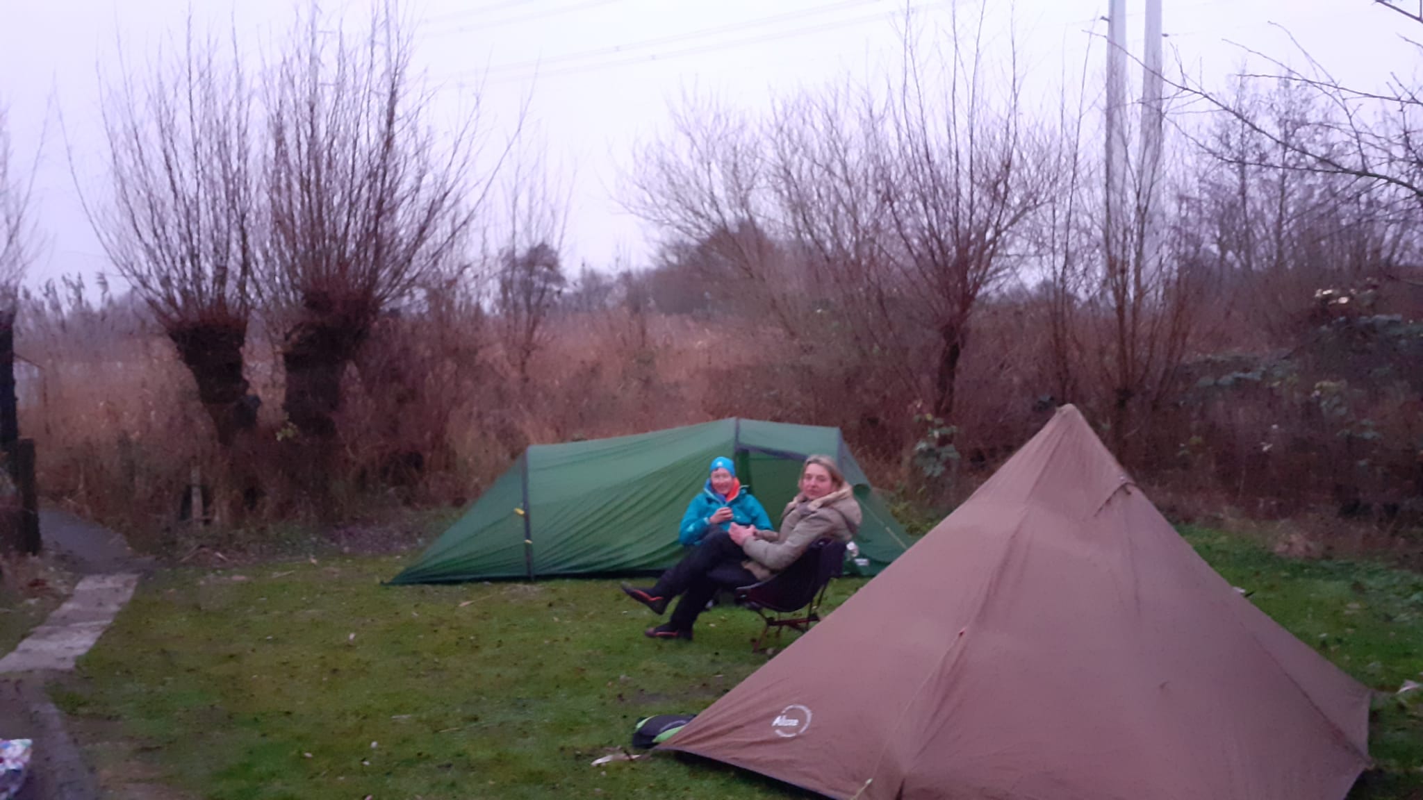 Zaterdagmorgen 27 december, de stille dagen tussen Kerst en de jaarwisseling. Grijzig en iets boven het vriespunt. Noordenwind kracht 2. We pakken onze boten in en gaan op pad. Een enkele visser is er ook, verder is het helemaal stil. Het is goed te doen, de kajak voelt met alle kilo's vooral stabieler aan. Op de Braassem even iets meer wind. Linksaf de ringvaart op. Genieten van de huizen met kerstlichtjes en af en toe zwaaien naar mensen op de kant. Dan weer de bewoonde wereld uit naar de Hanepoel. Er ligt langs de kant een dun vliesje ijs. Bij de overnachtingsplek is een groep mensen aan het wilgen knotten, ze ronden af als wij aankomen. Tent opzetten met toeschouwers, daar was ik niet op bedacht. We maken lekker warm avondeten. Al snel wordt het rustiger, je hoort wel vliegtuigen en auto's. Het wordt ook niet echt donker. De ganzen en andere vogels laten zich horen, dat is mooi. Midden in de Randstad is dit een heel bijzondere ervaring.